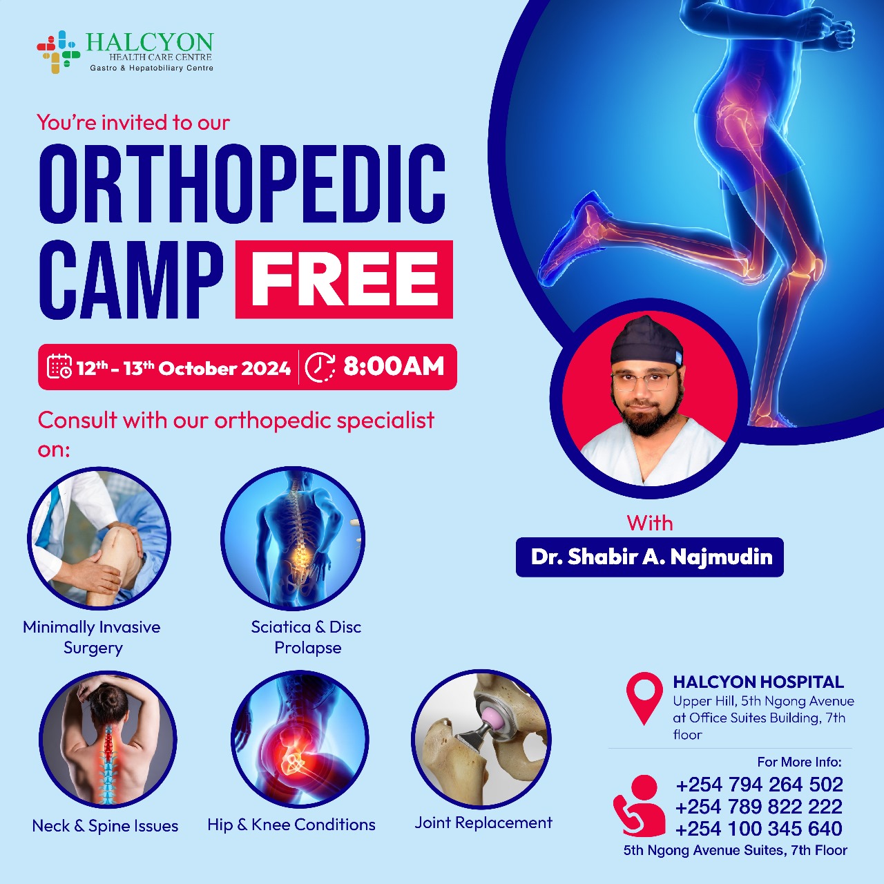 For two days, you’ll have the chance to meet Dr. Shabir Najmudin, a highly respected orthopedic and trauma surgeon. He’ll provide personalized assessments to help you understand your condition better and share insights on managing your health.